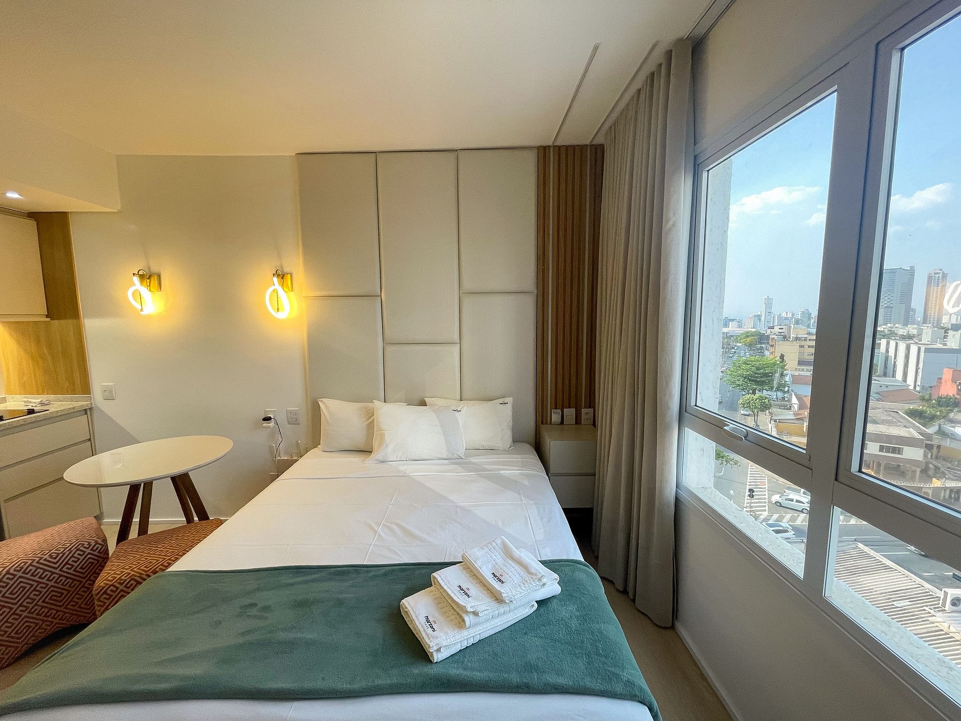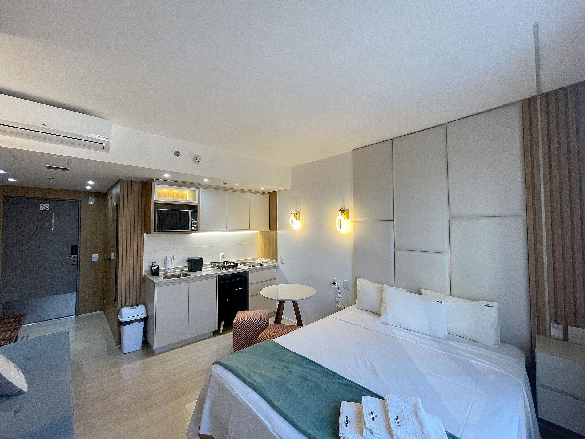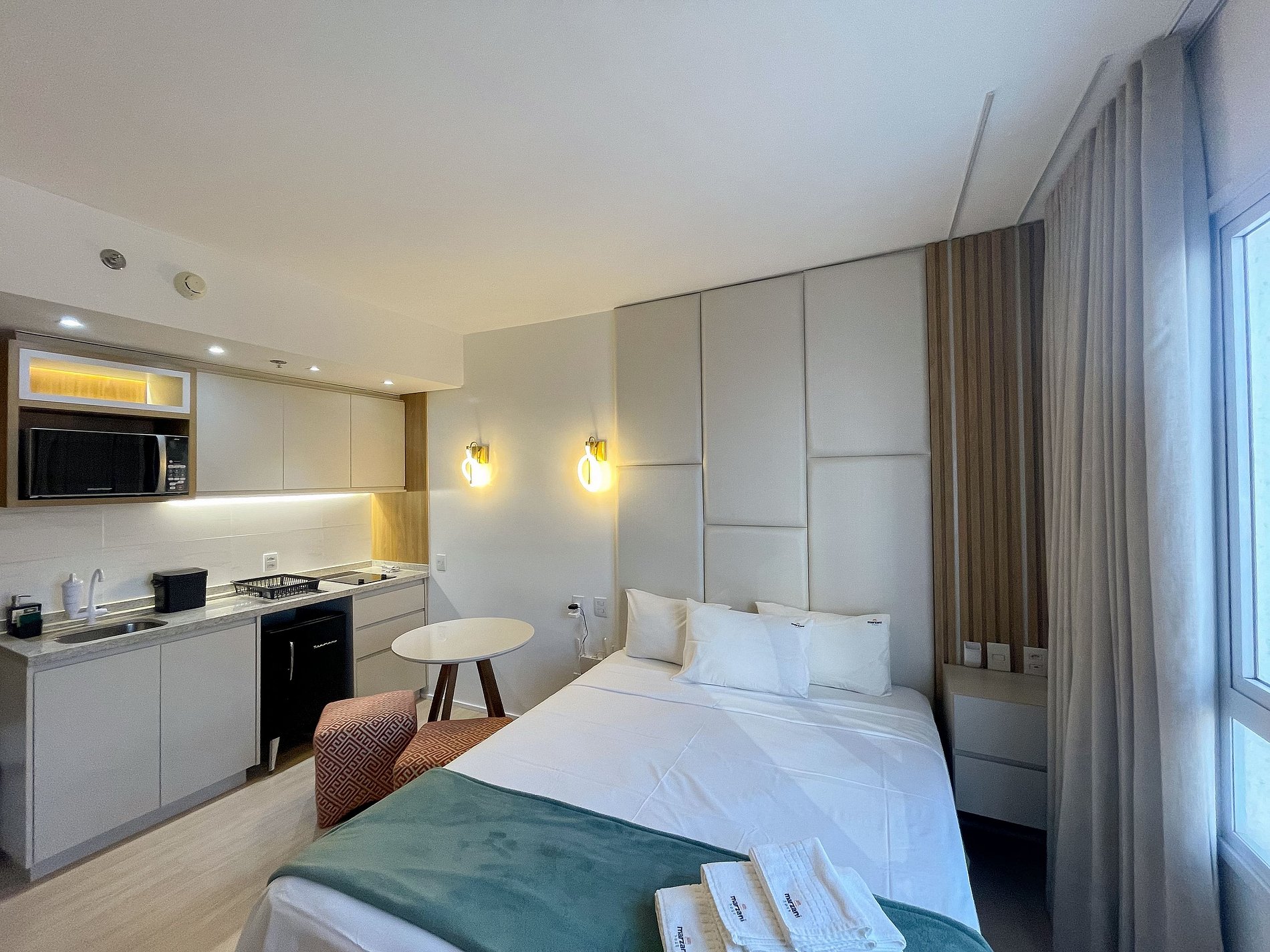 Possui os itens básicos (microondas, panelas, talheres, kit mesa posta, frigobar, roupa de cama, amenities, toalhas, etc )