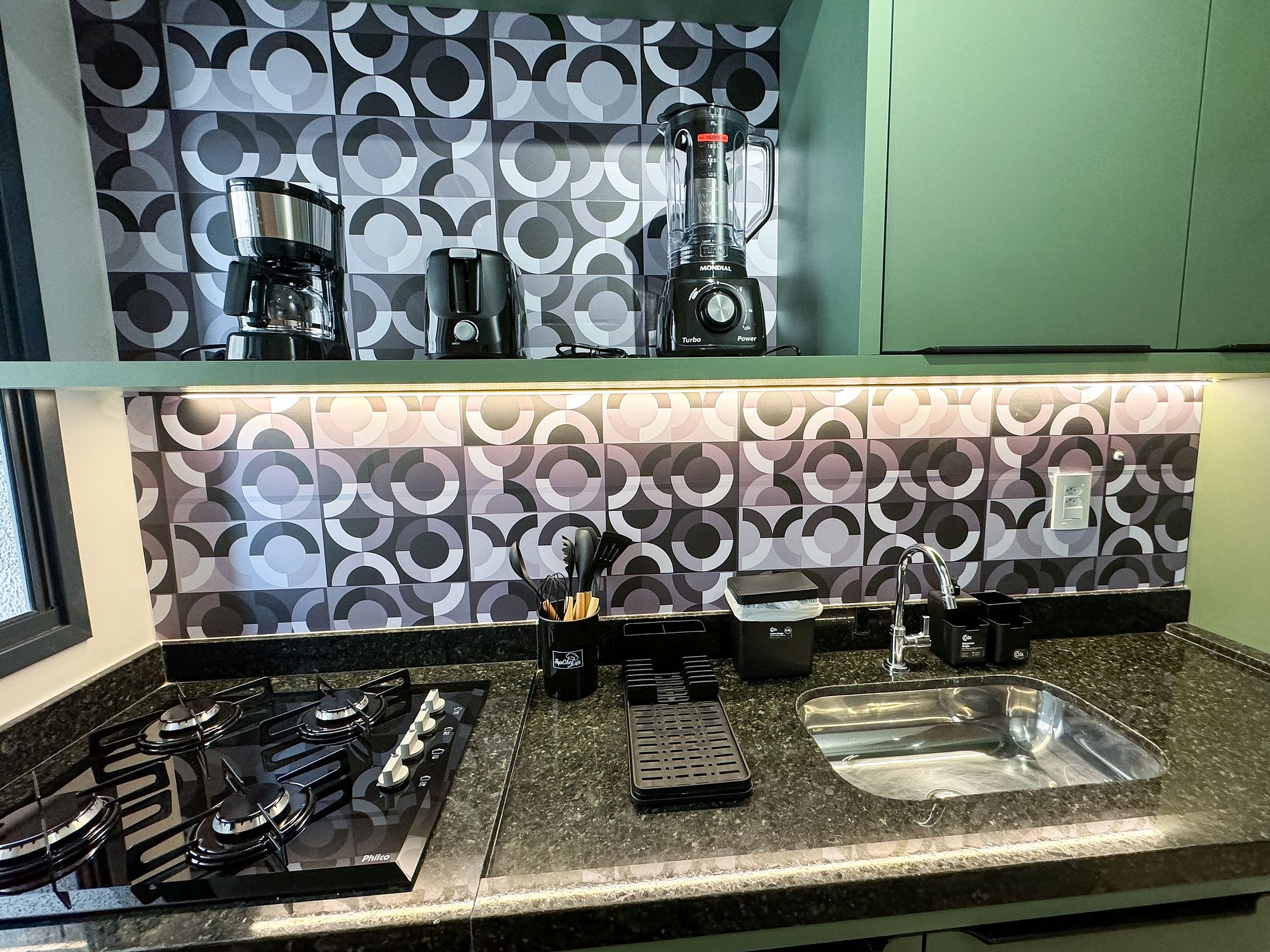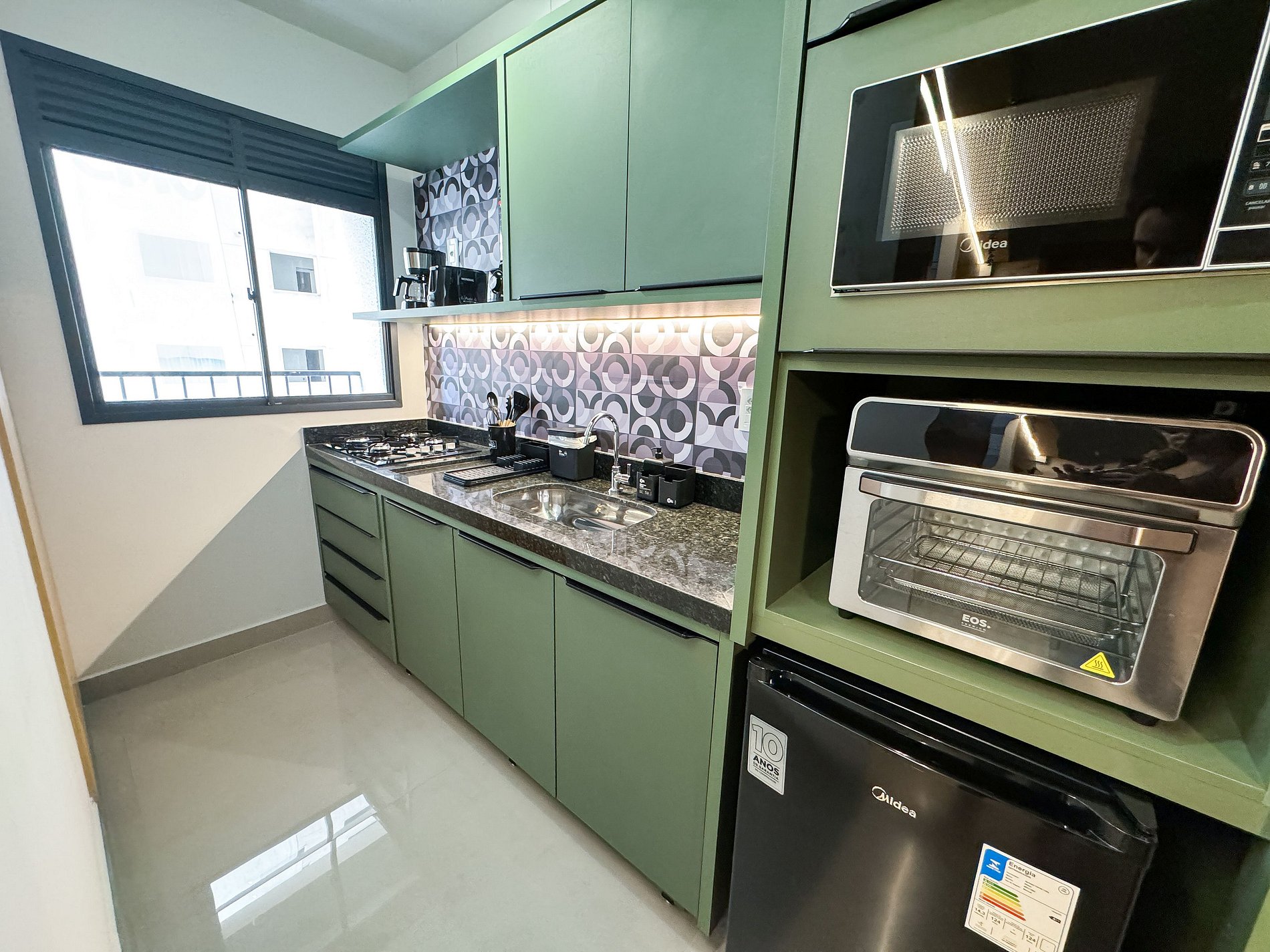 Possui os itens básicos (microondas, panelas, talheres, kit mesa posta, frigobar, roupa de cama, amenities, toalhas, etc)