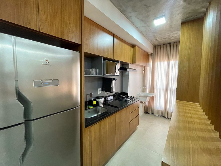 Possui os itens básicos (microondas, panelas, talheres, kit mesa posta, geladeira, roupa de cama, amenities, toalhas, etc)