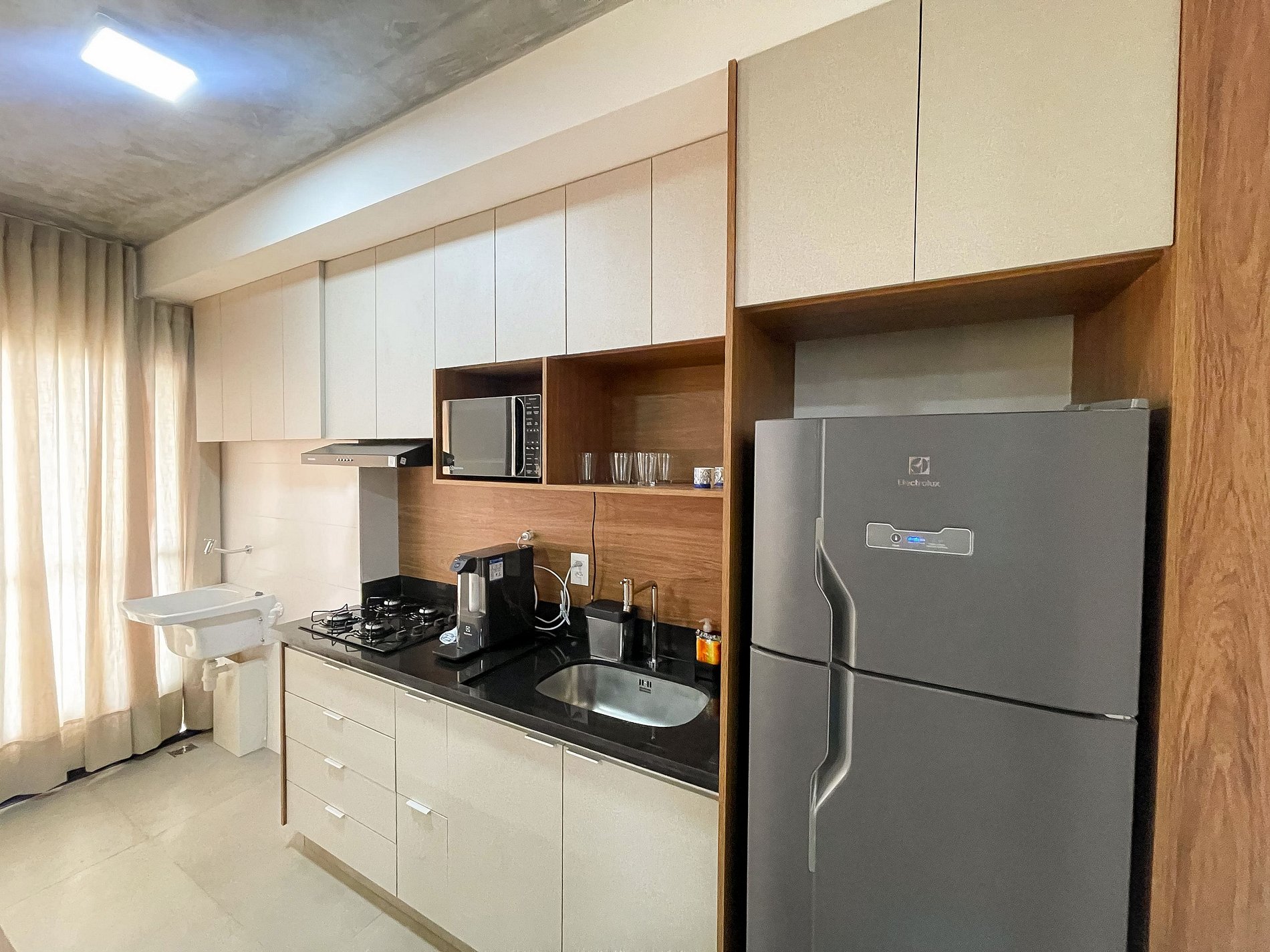 Possui os itens básicos (microondas, panelas, talheres, kit mesa posta, geladeira, roupa de cama, amenities, toalhas, etc)
