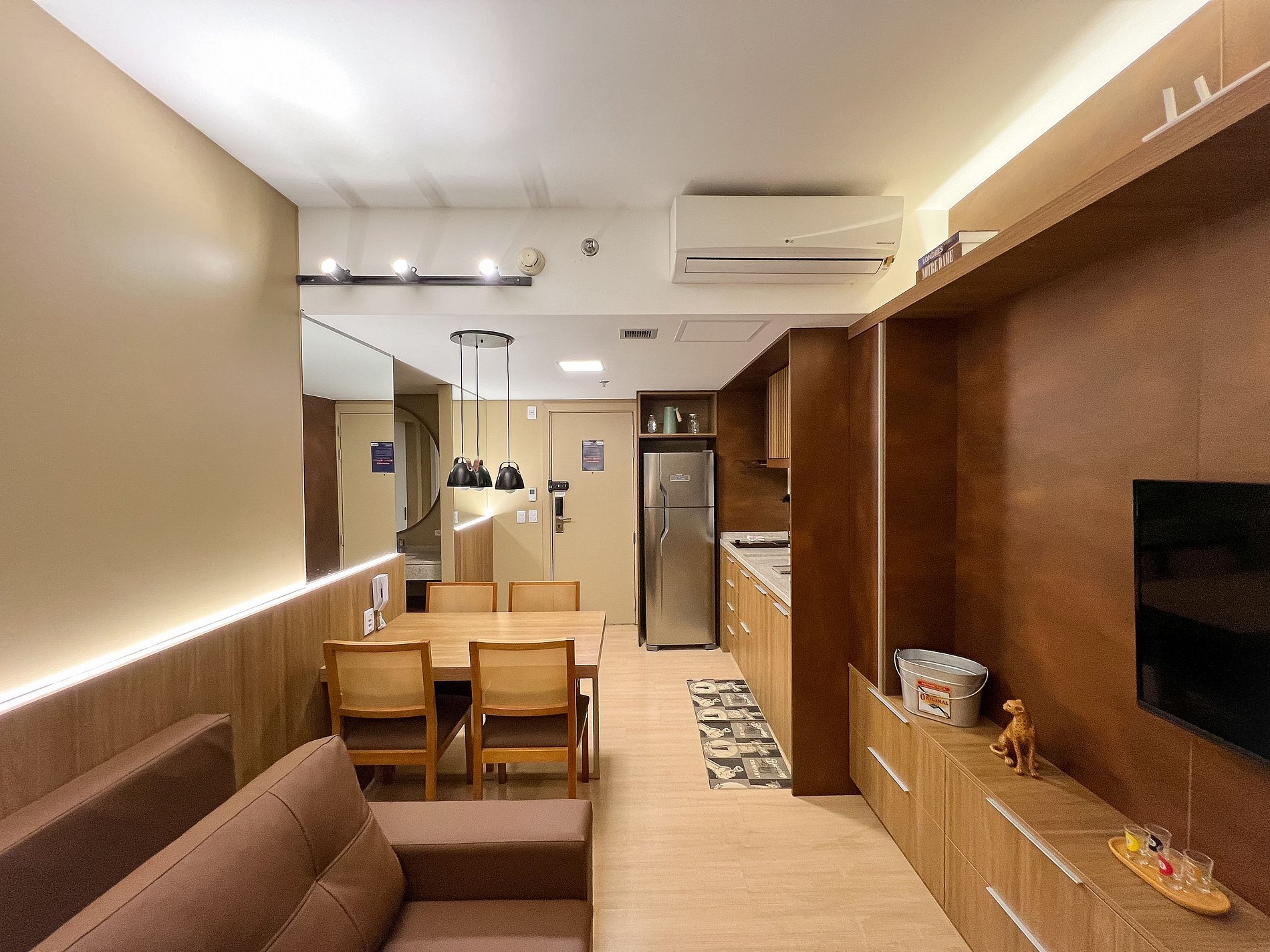 Possui os itens básicos (microondas, panelas, talheres, kit mesa posta, frigobar, roupa de cama, amenities, toalhas, etc)