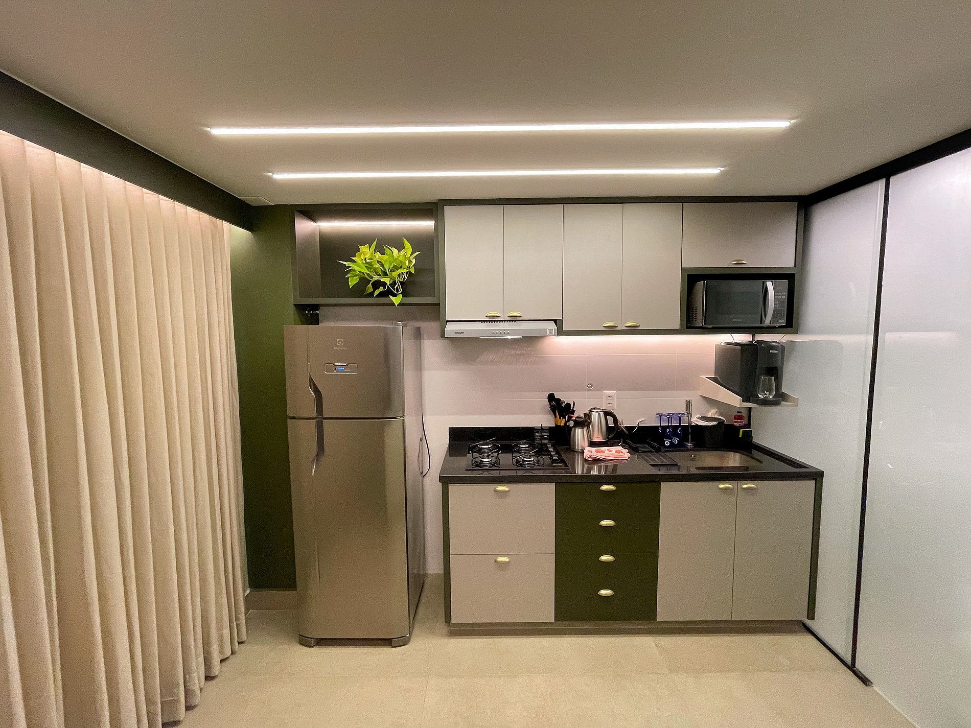 Possui os itens básicos (microondas, panelas, talheres, kit mesa posta, geladeira, roupa de cama, amenities, toalhas, etc)