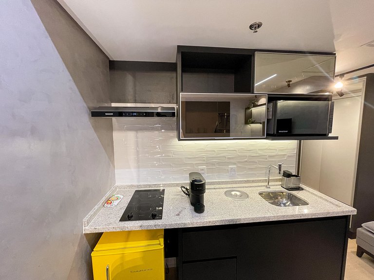 Possui os itens básicos (microondas, panelas, talheres, kit mesa posta, frigobar, roupa de cama, amenities, toalhas, etc )