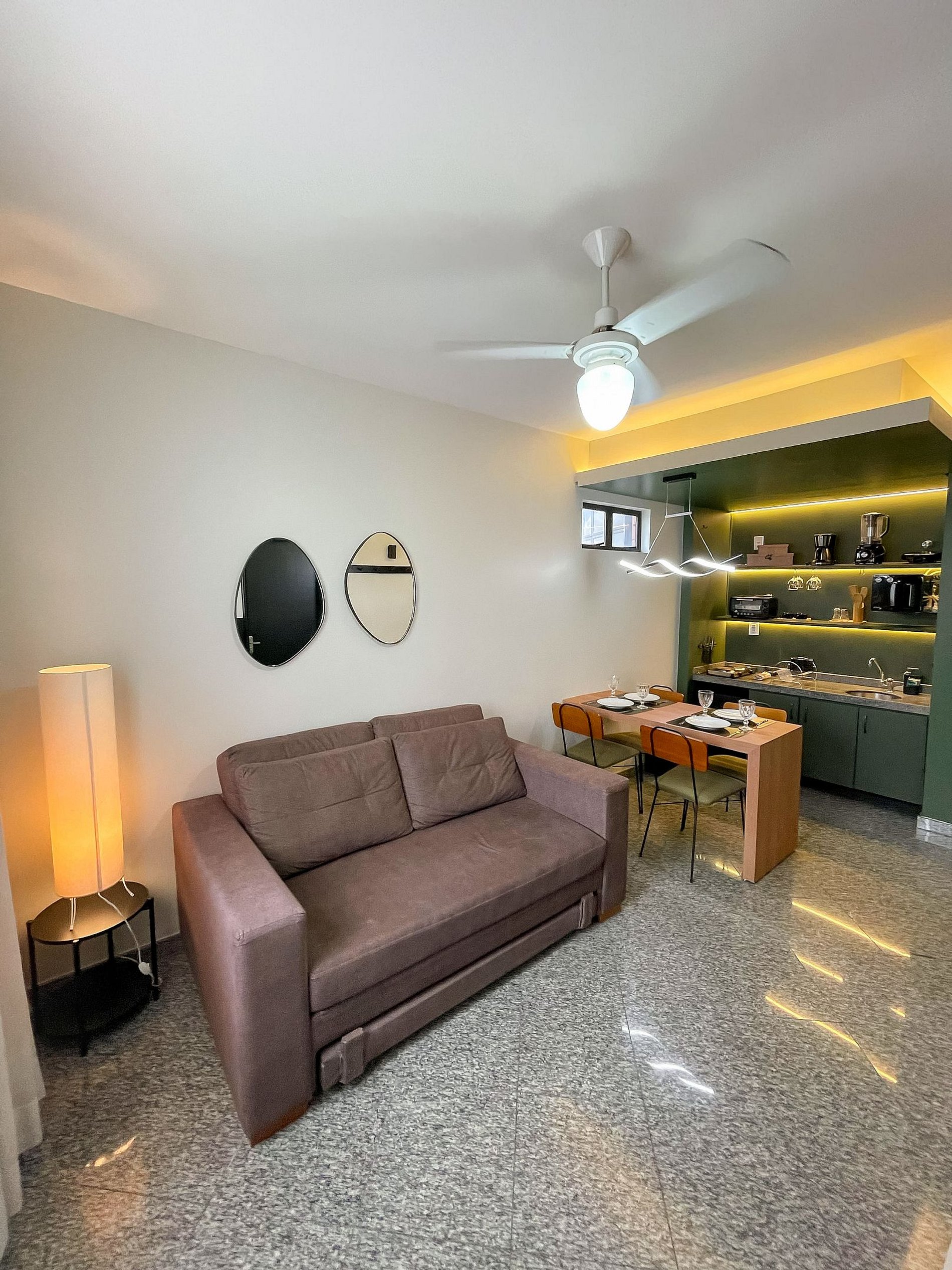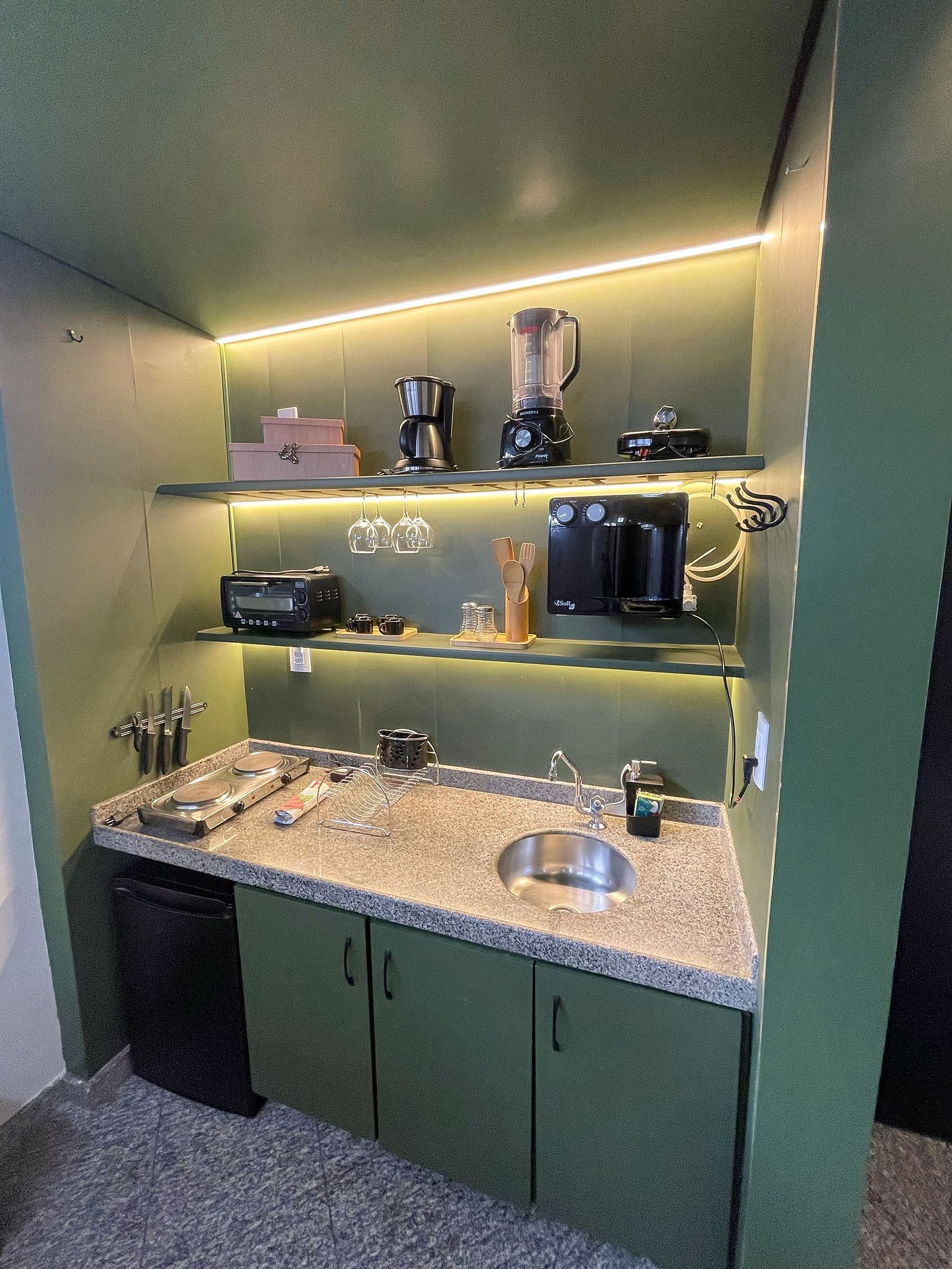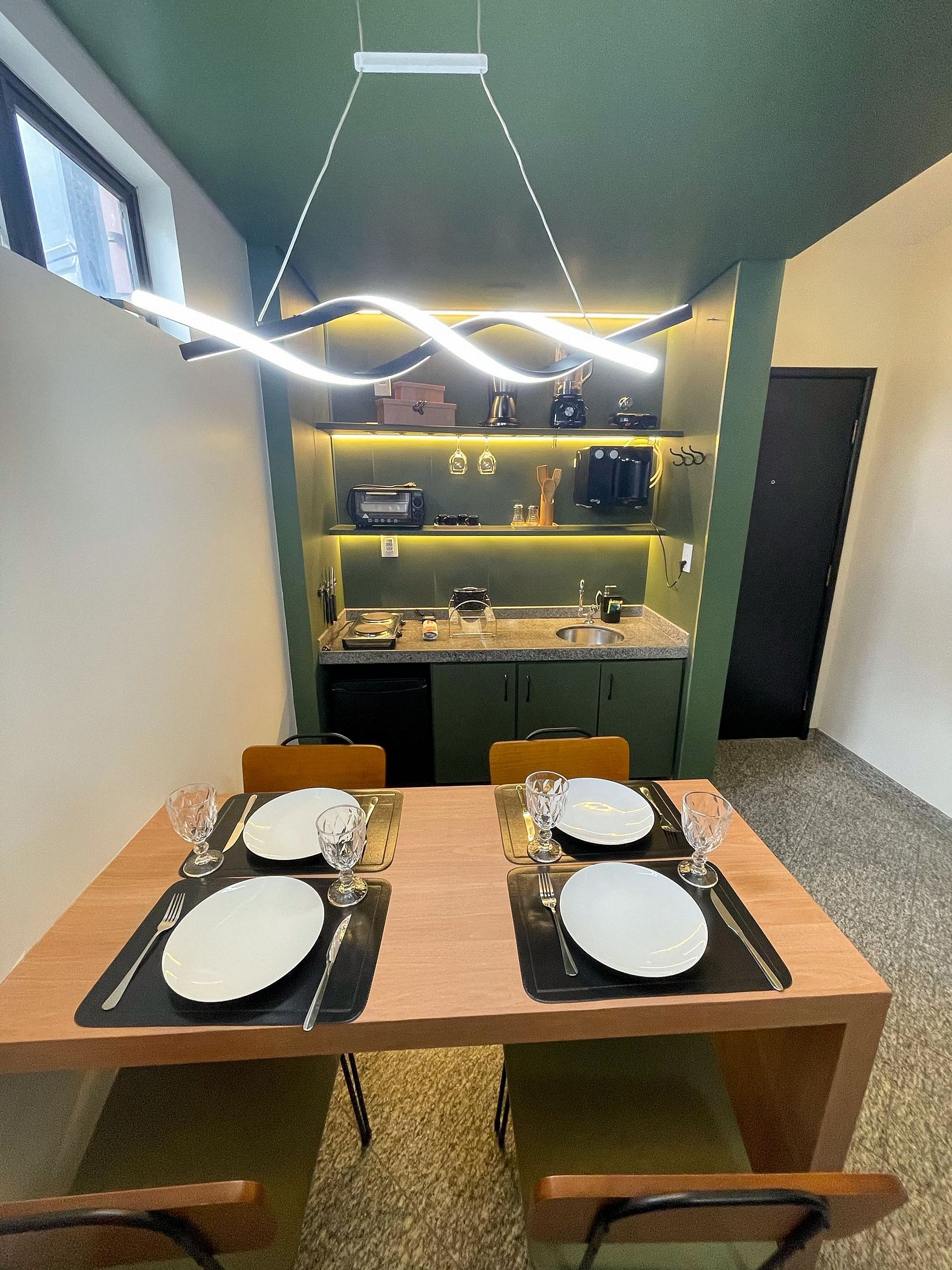 Possui os itens básicos (microondas, panelas, talheres, kit mesa posta, frigobar, roupa de cama, amenities, toalhas, etc)