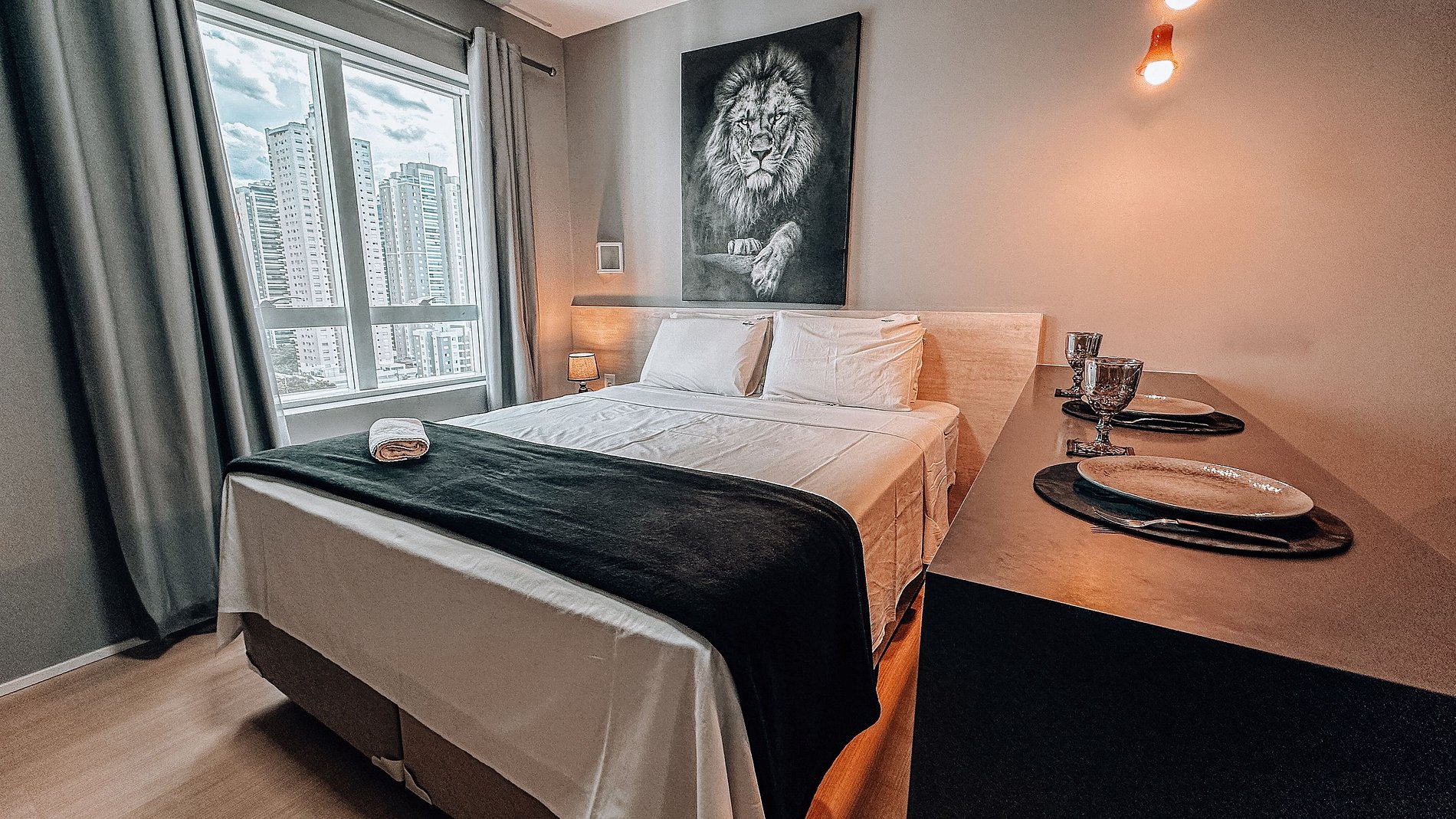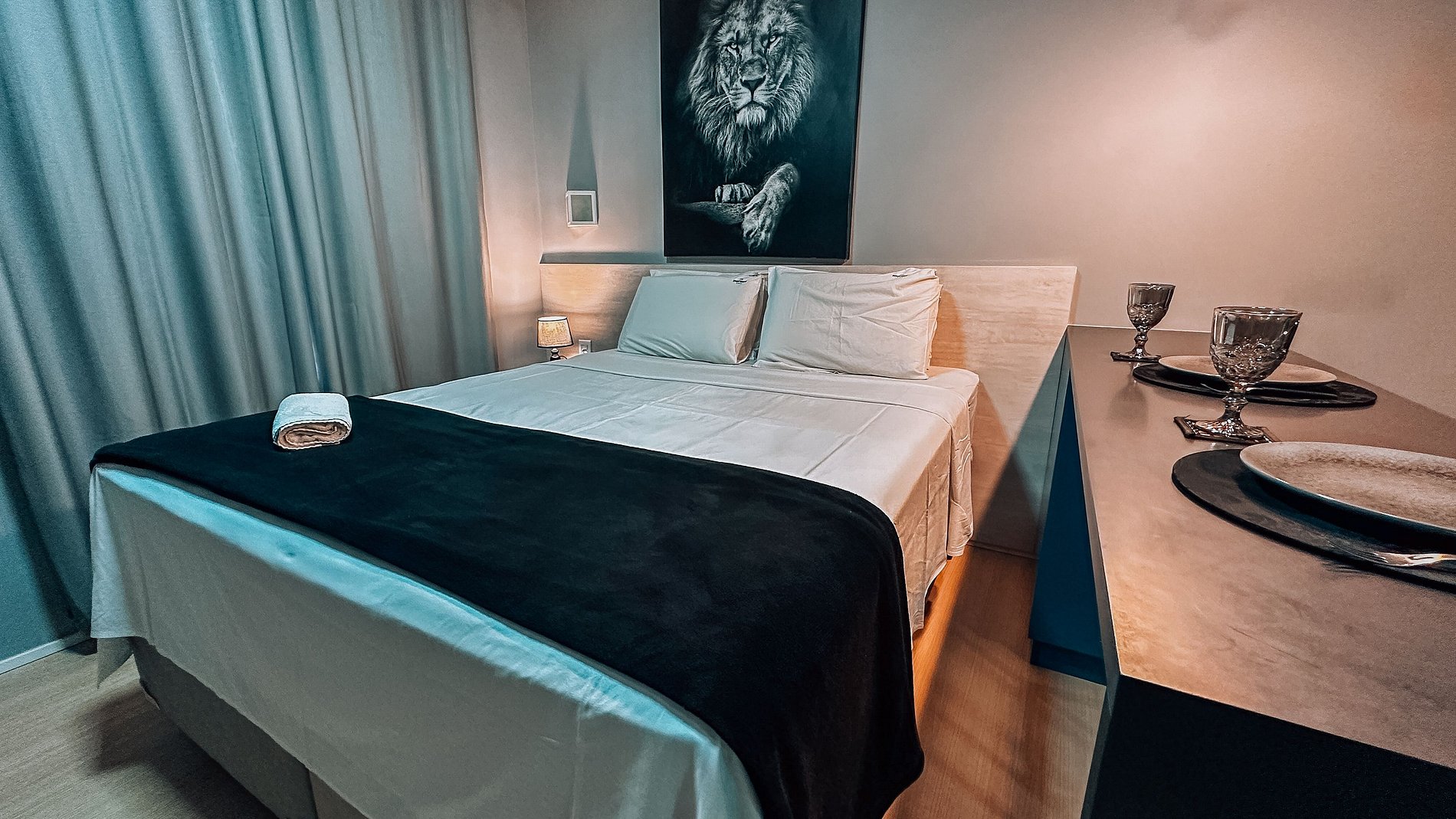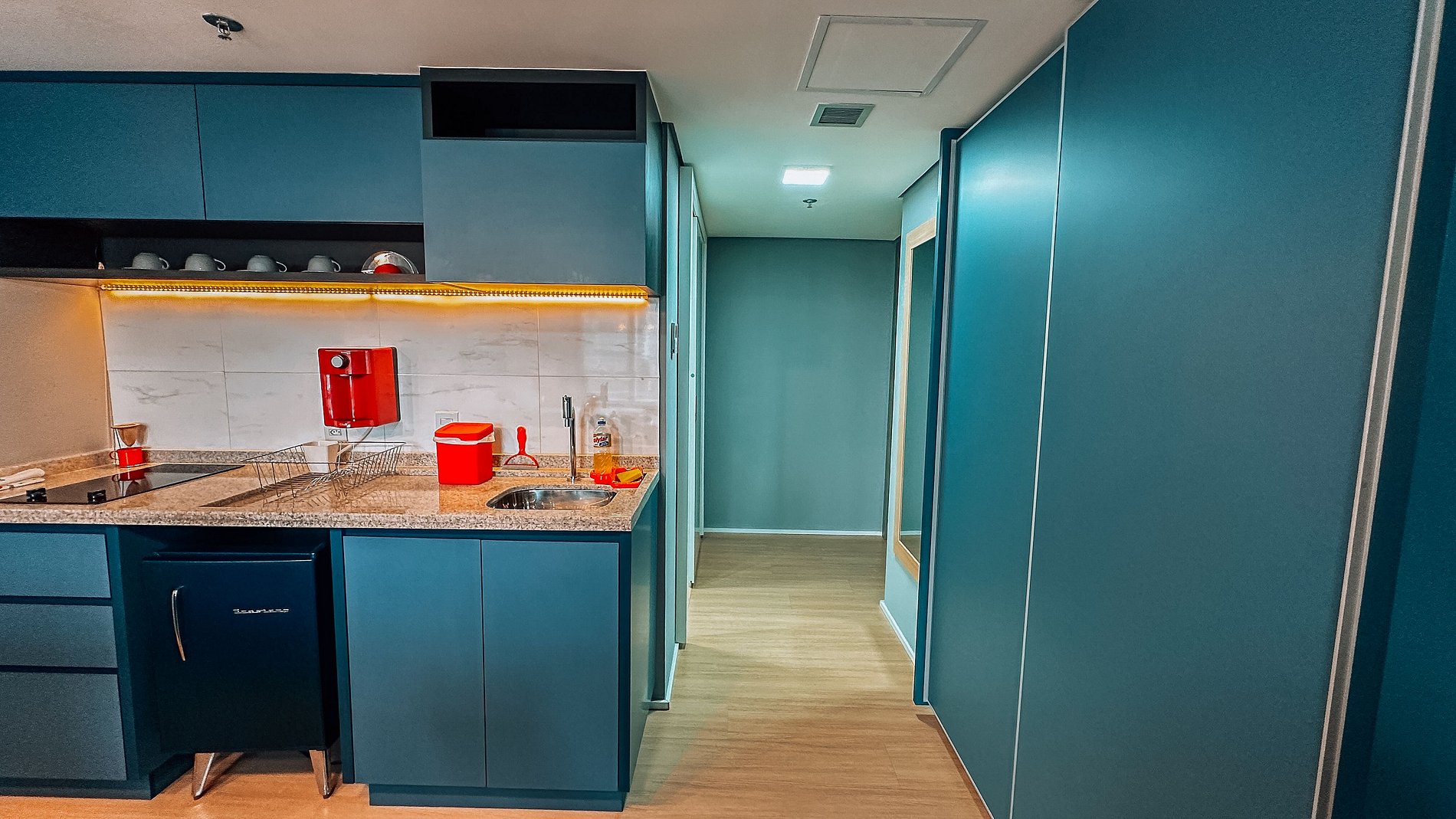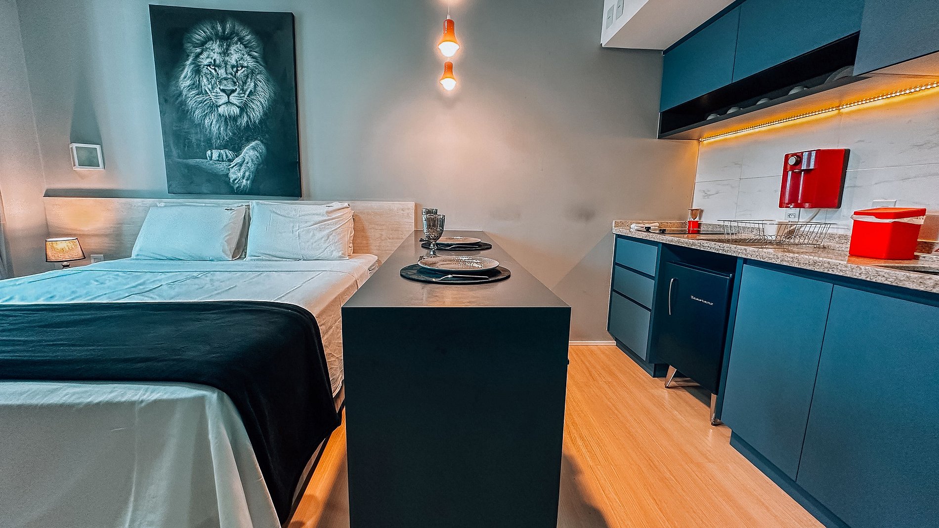 Possui os itens básicos (microondas, panelas, talheres, kit mesa posta, frigobar, roupa de cama, amenities, toalhas, etc)
