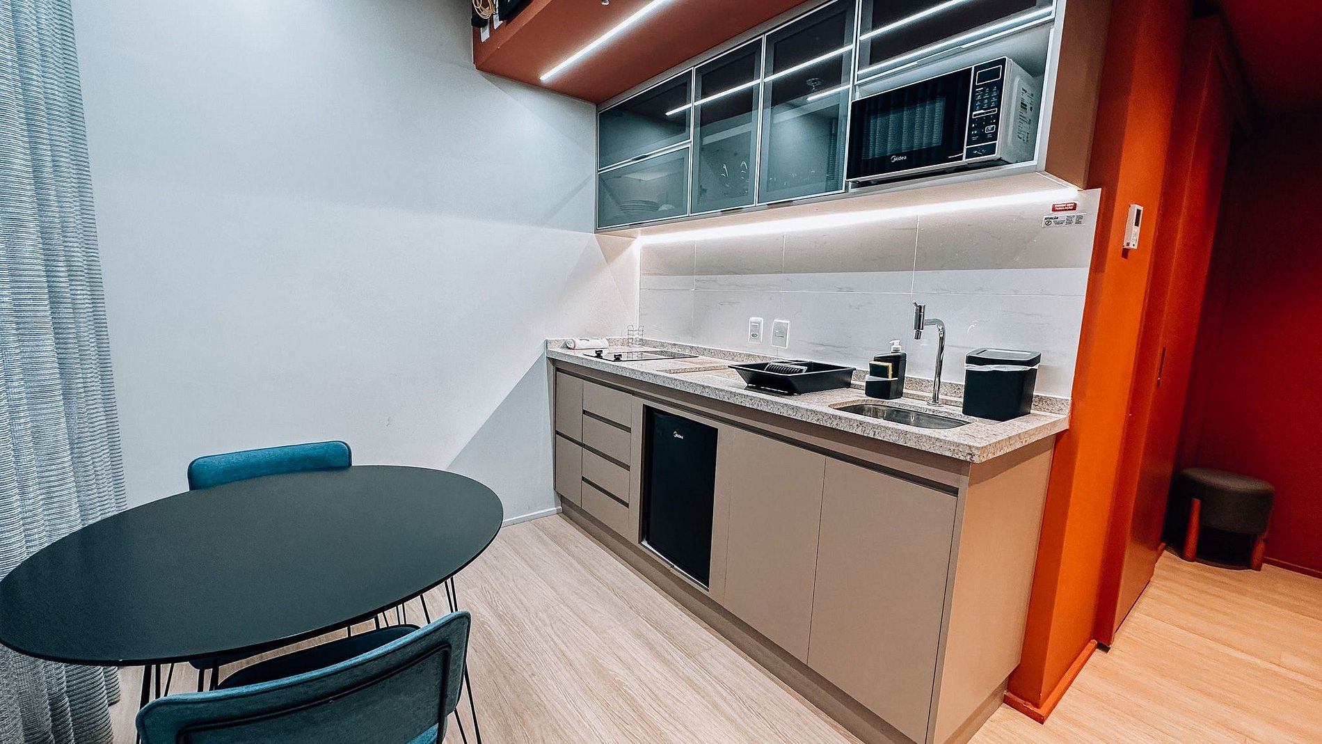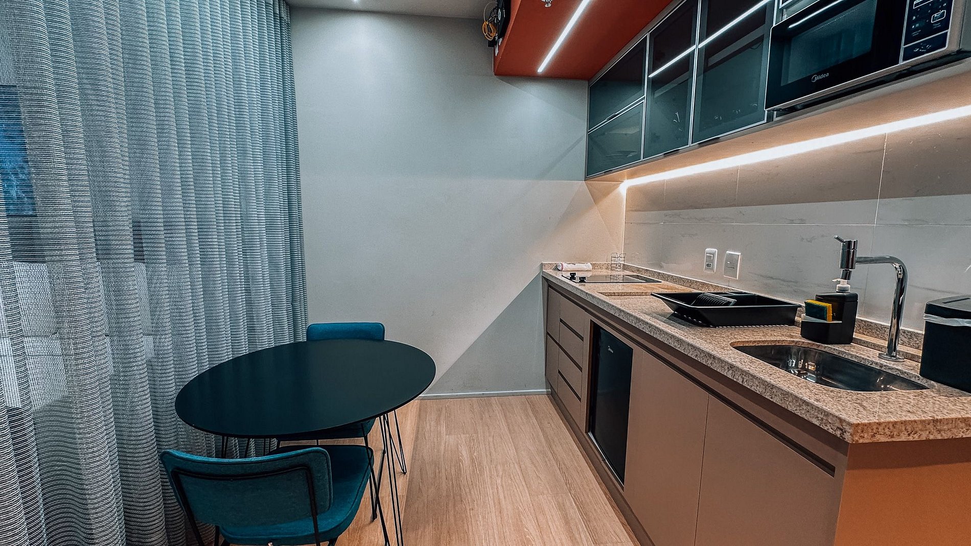 Possui os itens básicos (microondas, panelas, talheres, kit mesa posta, frigobar, roupa de cama, amenities, toalhas, etc)