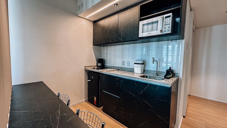Possui os itens básicos (microondas, panelas, talheres, kit mesa posta, frigobar, roupa de cama, amenities, toalhas, etc)
