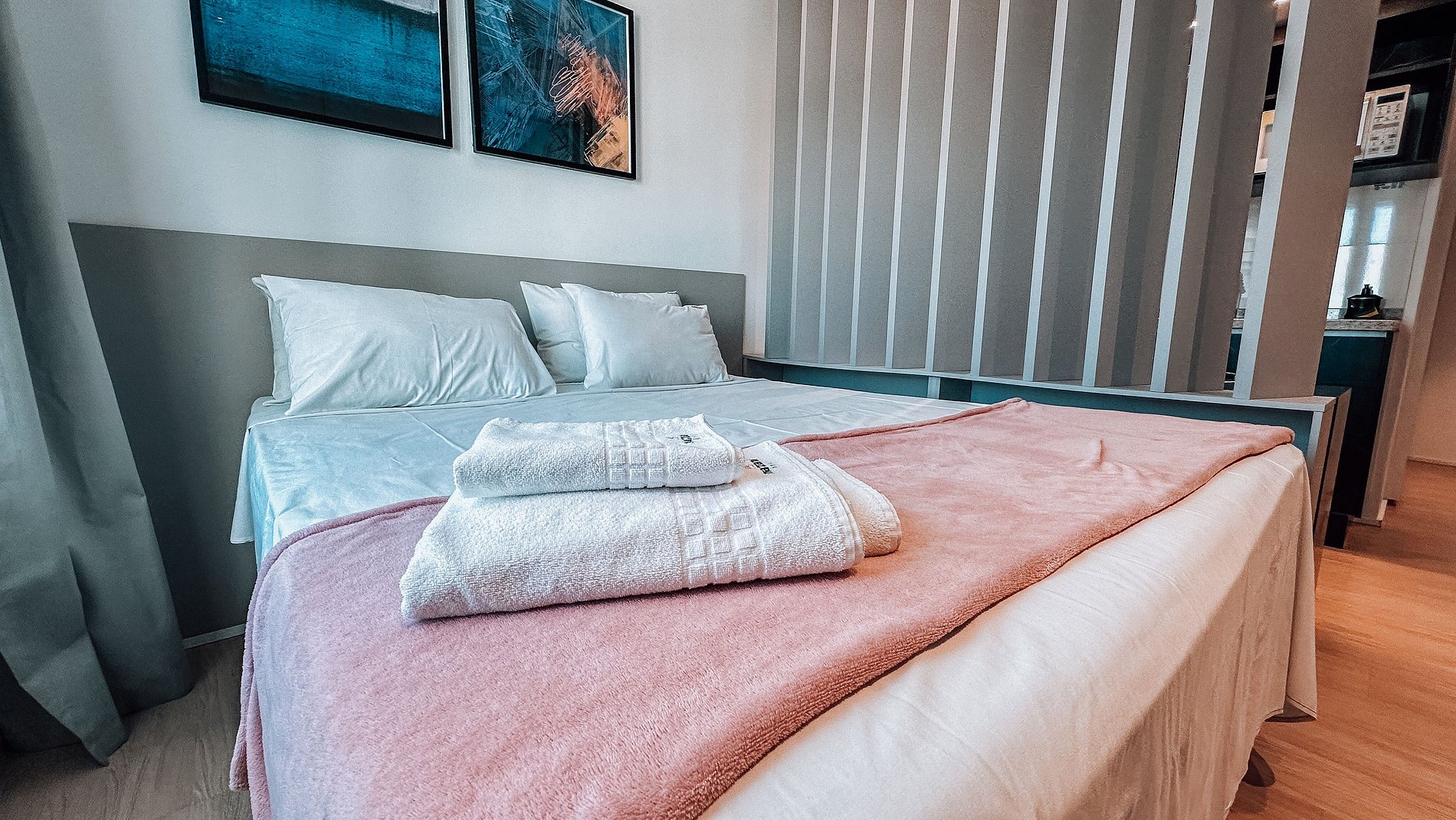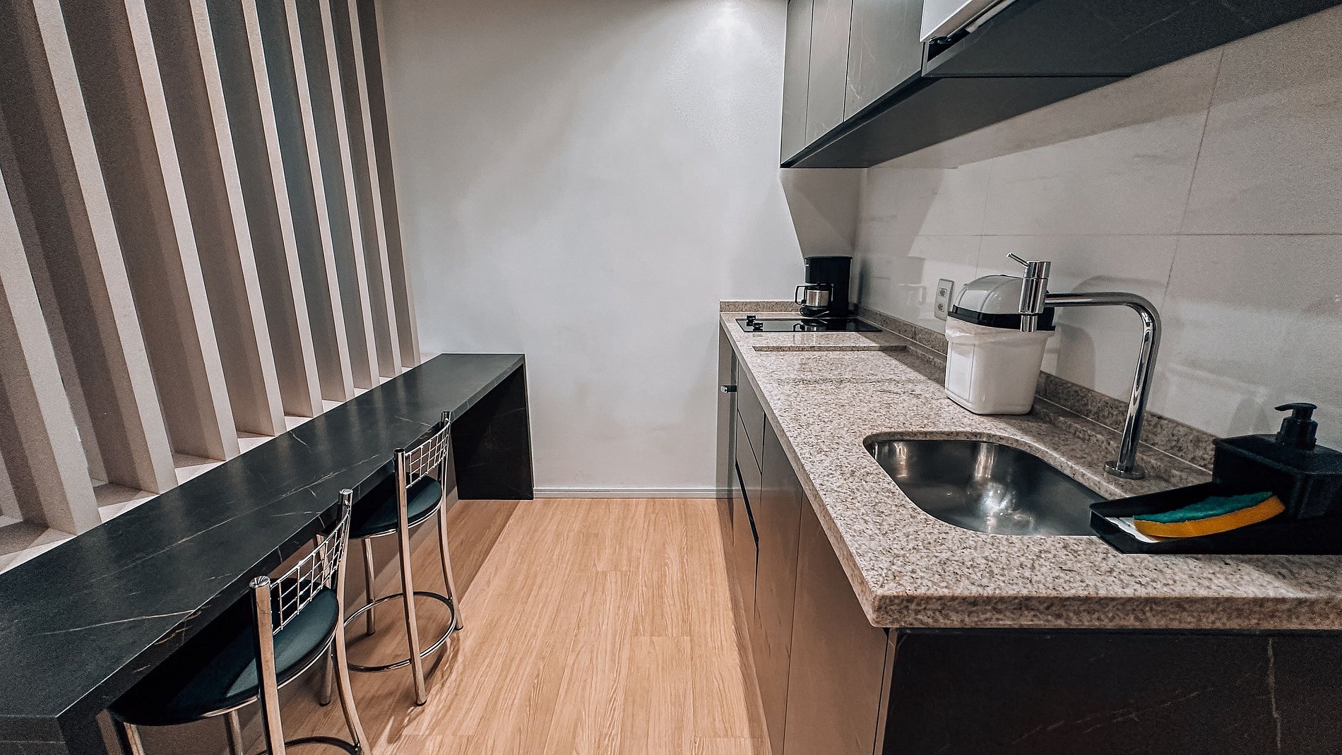 Possui os itens básicos (microondas, panelas, talheres, kit mesa posta, frigobar, roupa de cama, amenities, toalhas, etc)