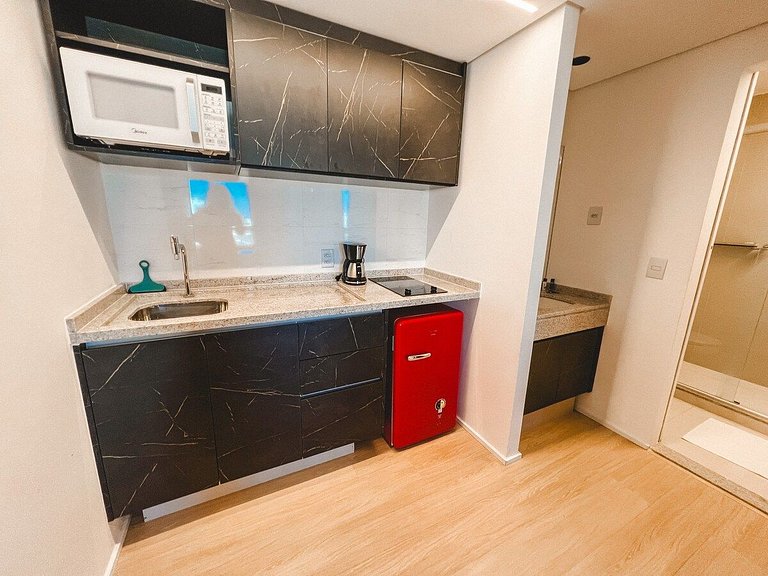Possui os itens básicos (microondas, panelas, talheres, kit mesa posta, frigobar, roupa de cama, amenities, toalhas, etc)