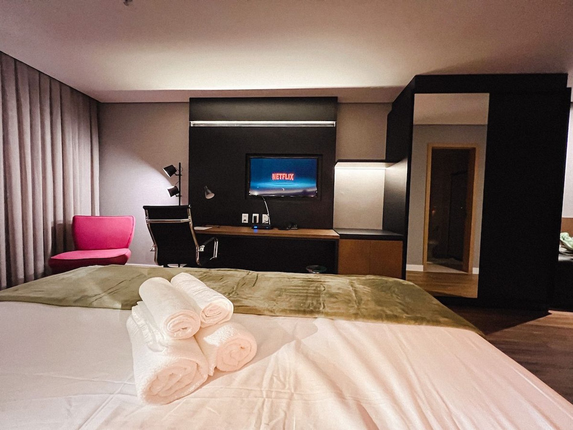 #1007 Fique em um lugar sofisticado perto de tudo o que você quer visitar. Esse quarto super espaçoso com uma cama king, ar condicionado, frigobar, tv a cabo, sofá para leitura, desk para seu home office. Você estará perto de tudo, super bem localizado e ainda poderá usufruir do restaurante L'etoile D'argent com sua deliciosa gastronomia francesa. Piscina red pool no rooftop com vista para Goiânia, academia completamente equipada para seus treinos ficarem em dia. Venha viver essa experiência.