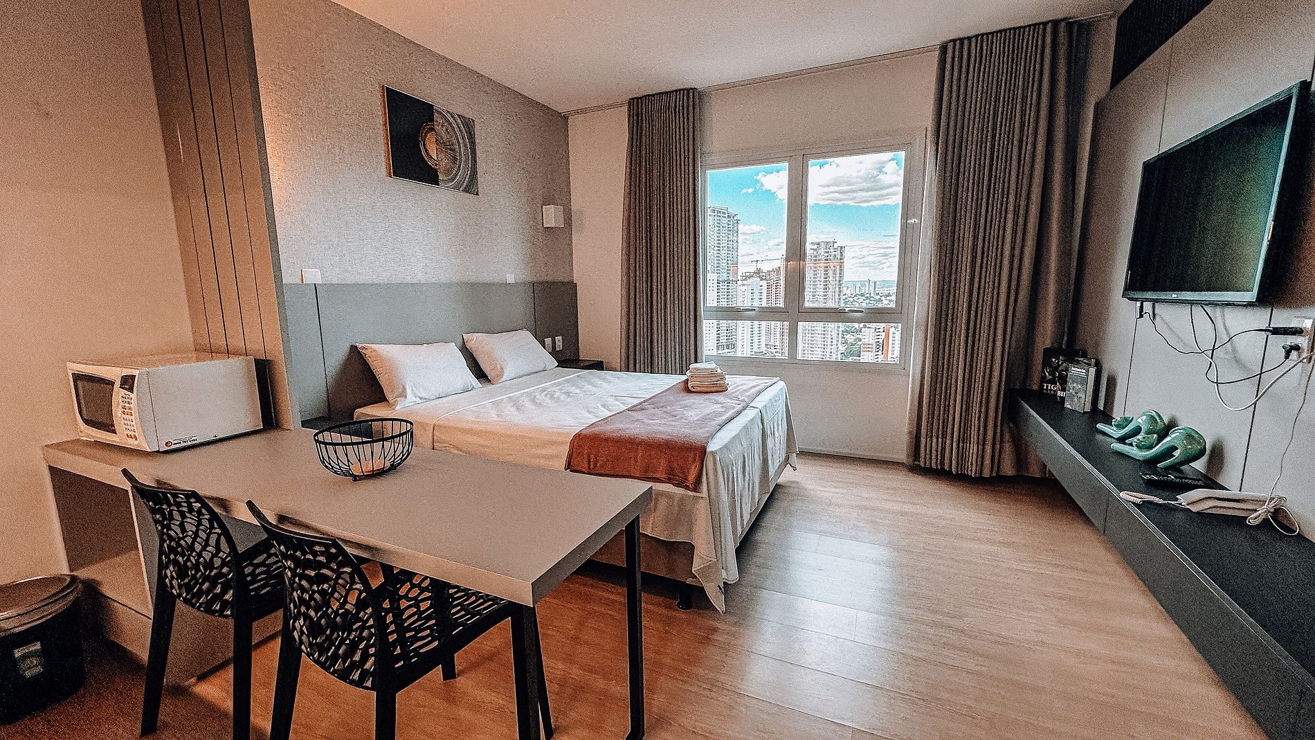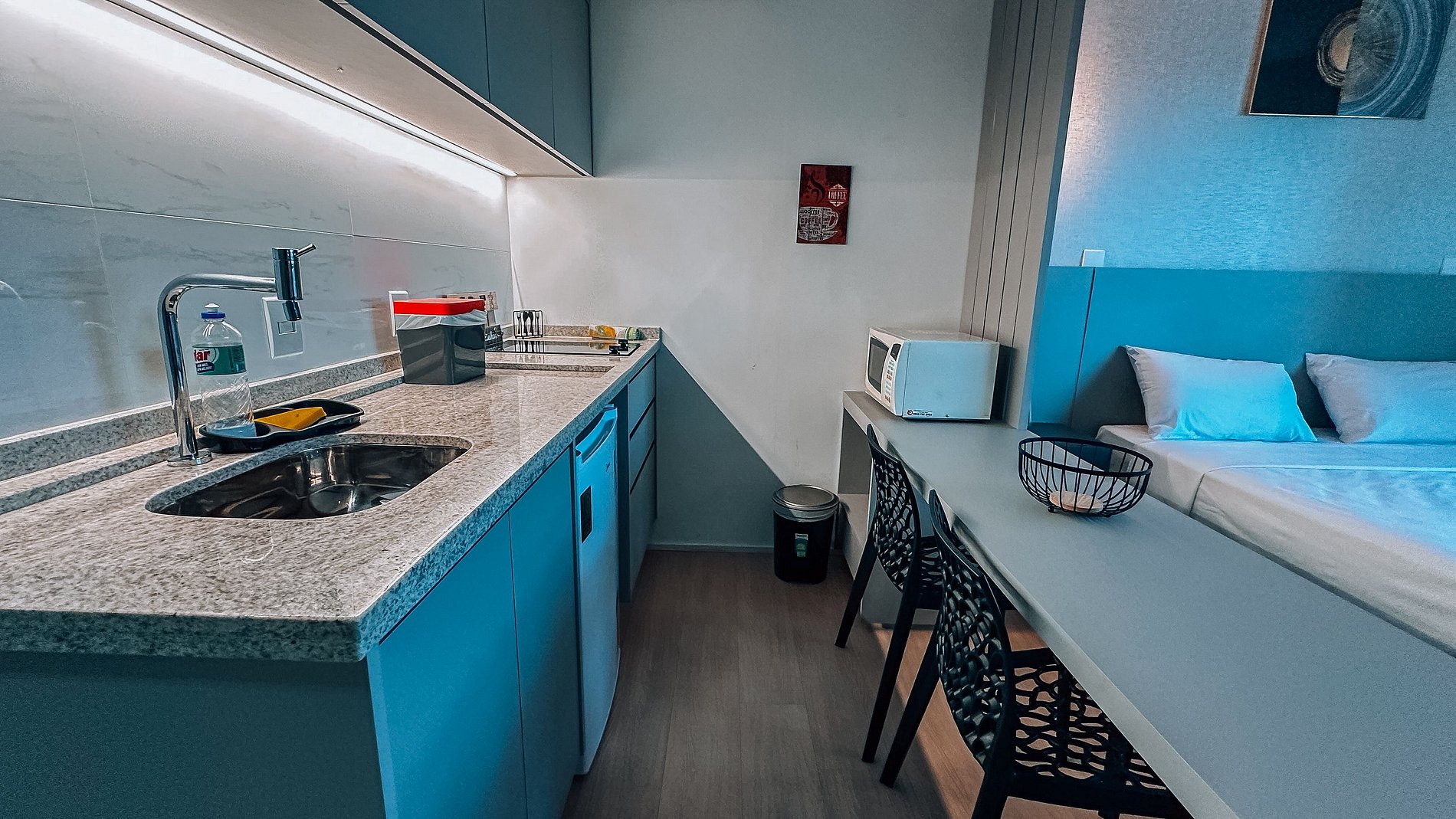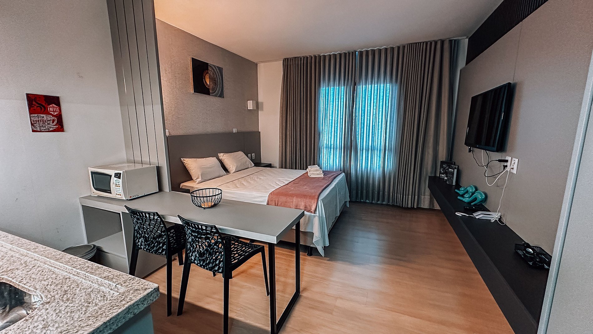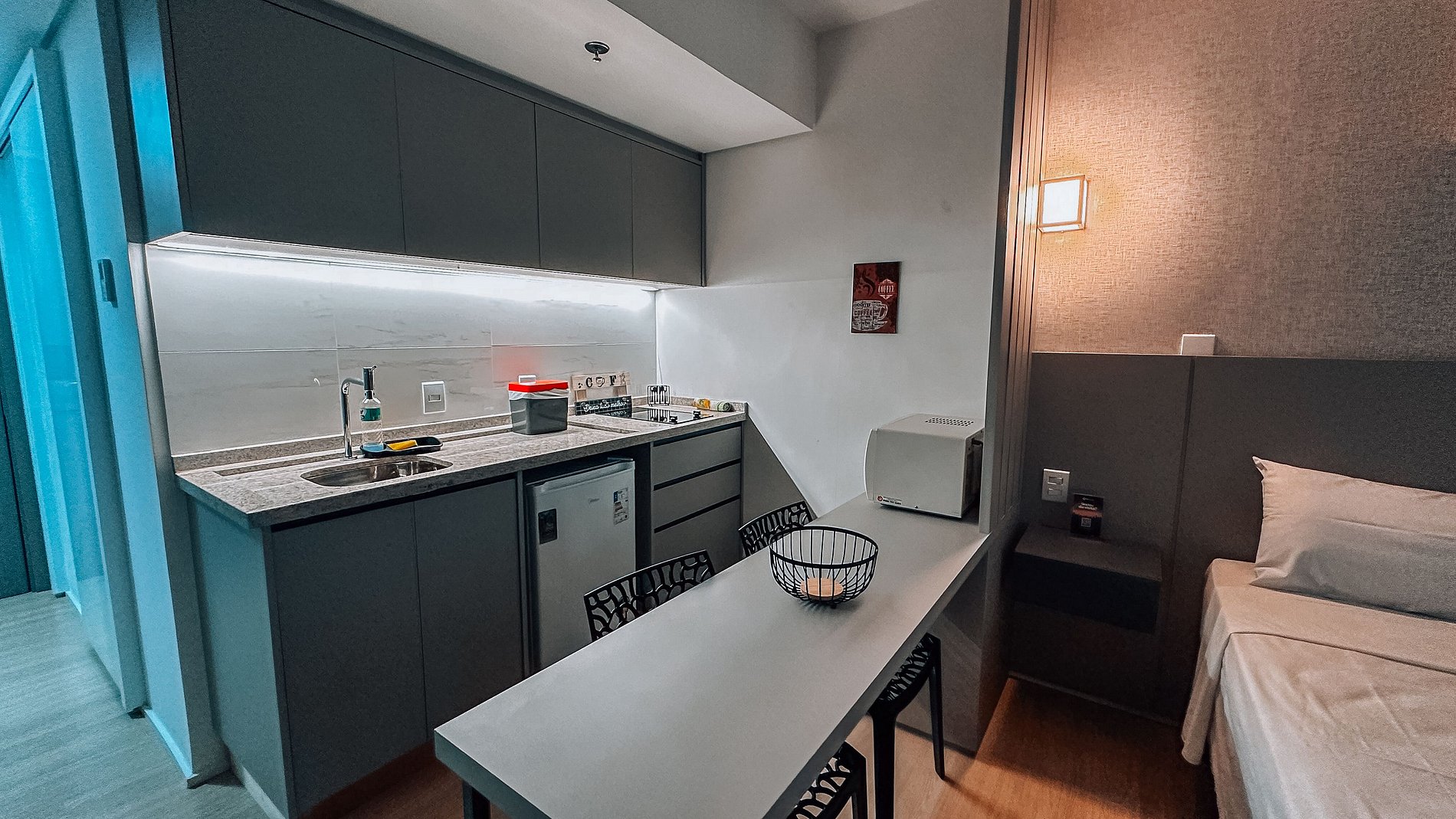 Possui os itens básicos (microondas, panelas, talheres, kit mesa posta, frigobar, roupa de cama, amenities, toalhas, etc)