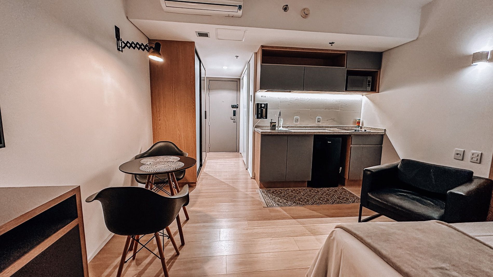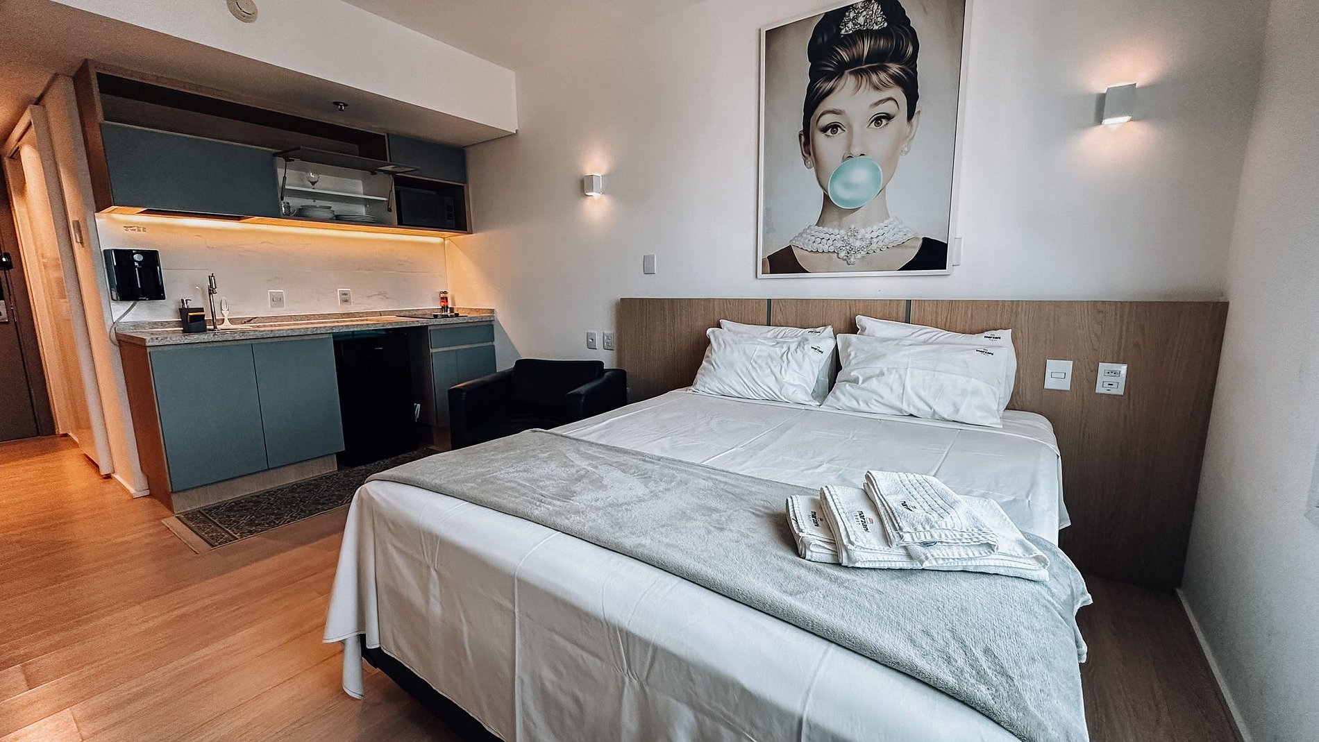 Possui os itens básicos (microondas, panelas, talheres, kit mesa posta, frigobar, roupa de cama, amenities, toalhas, etc)
