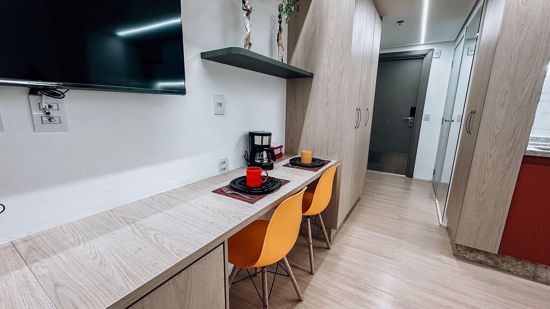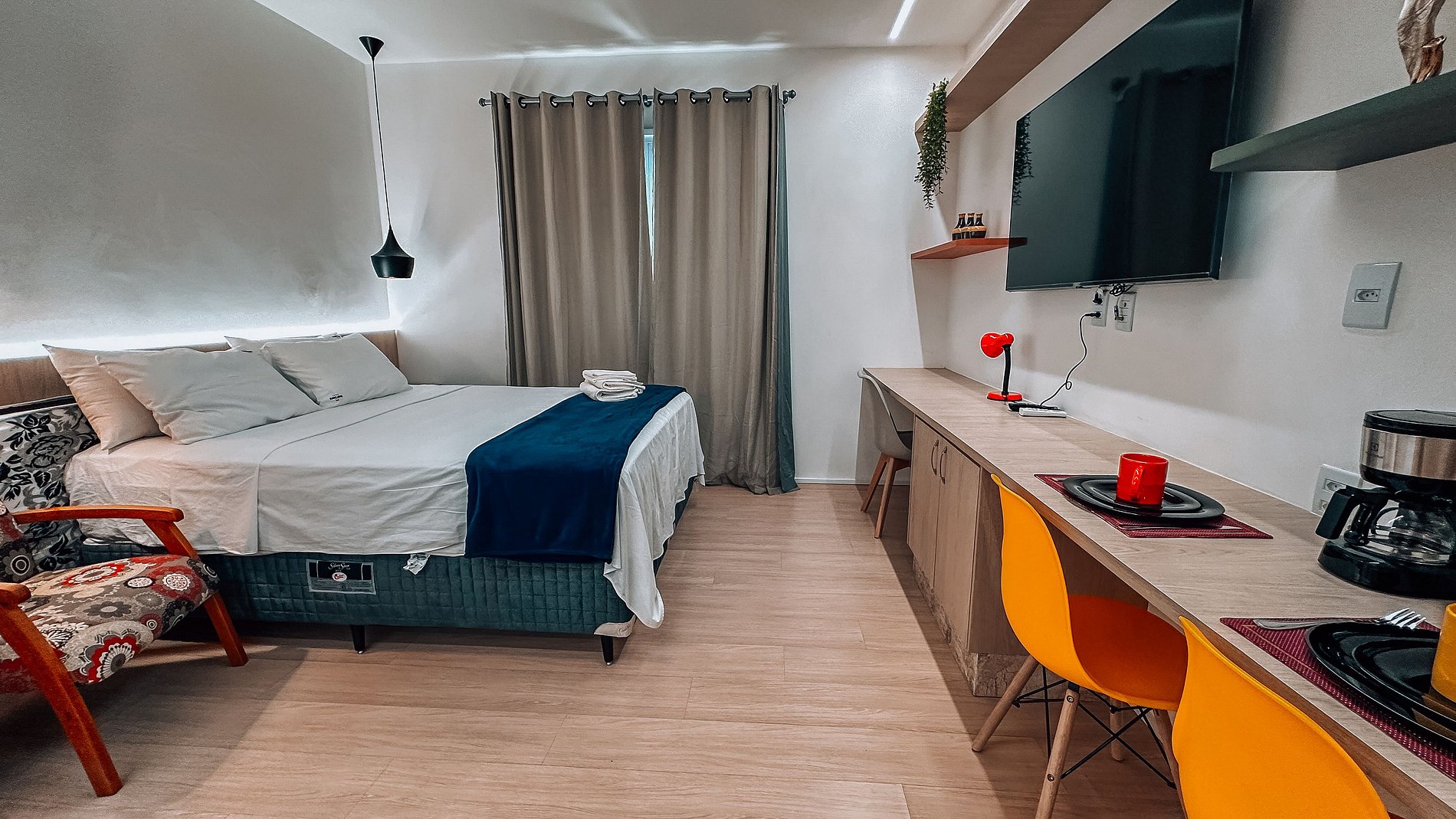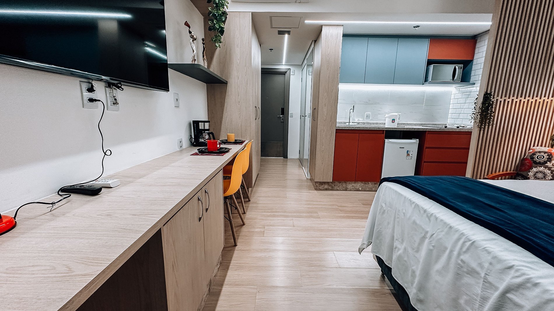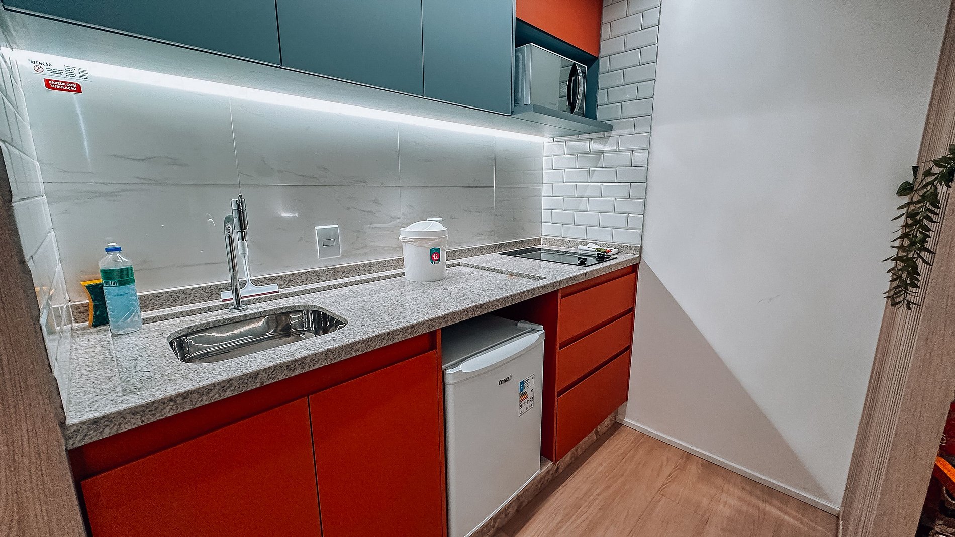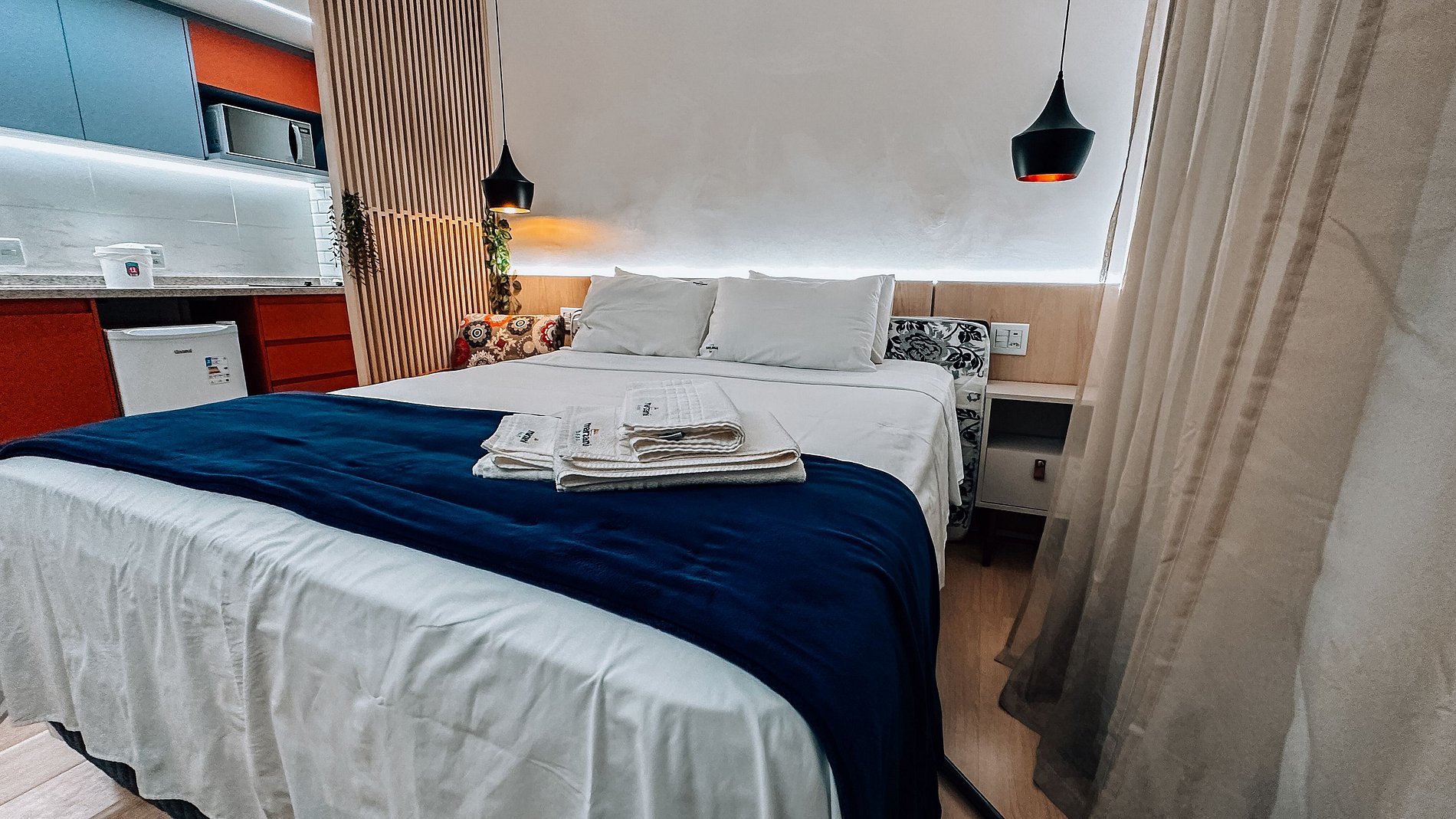 Possui os itens básicos (microondas, panelas, talheres, kit mesa posta, frigobar, roupa de cama, amenities, toalhas, etc )