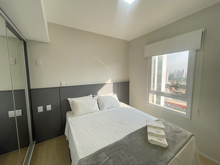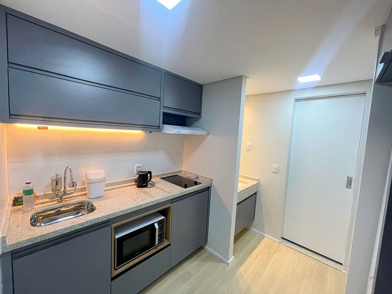 Possui os itens básicos (microondas, panelas, talheres, kit mesa posta, frigobar, roupa de cama, amenities, toalhas, etc )