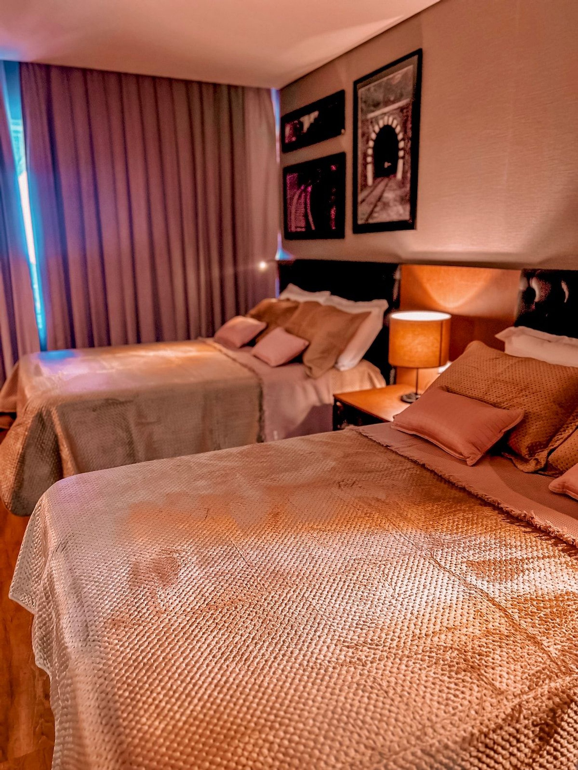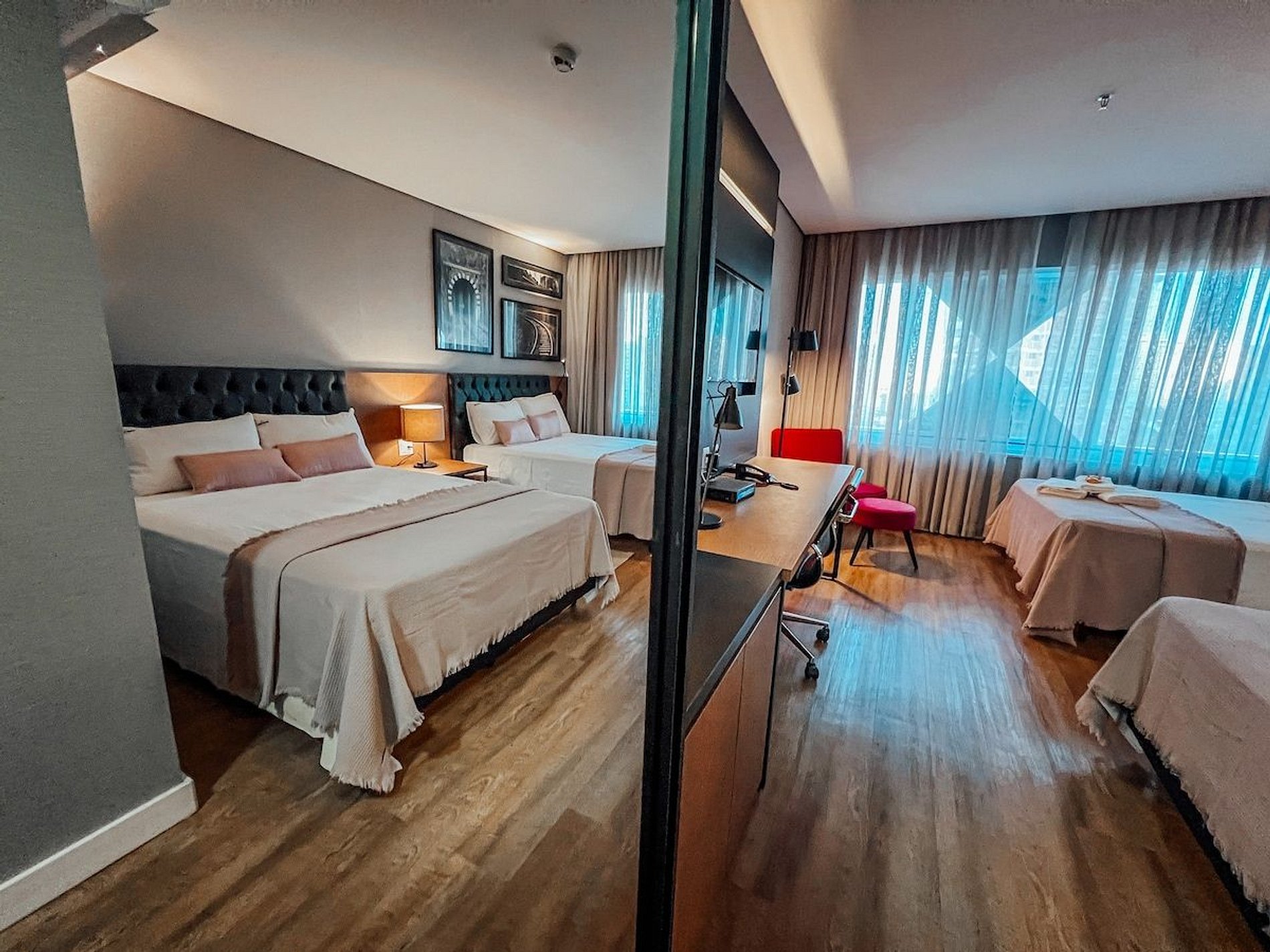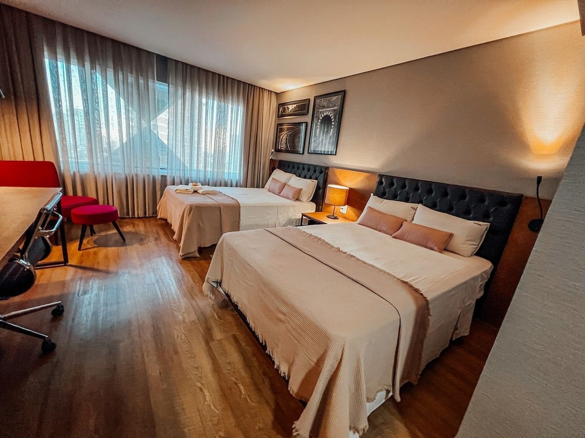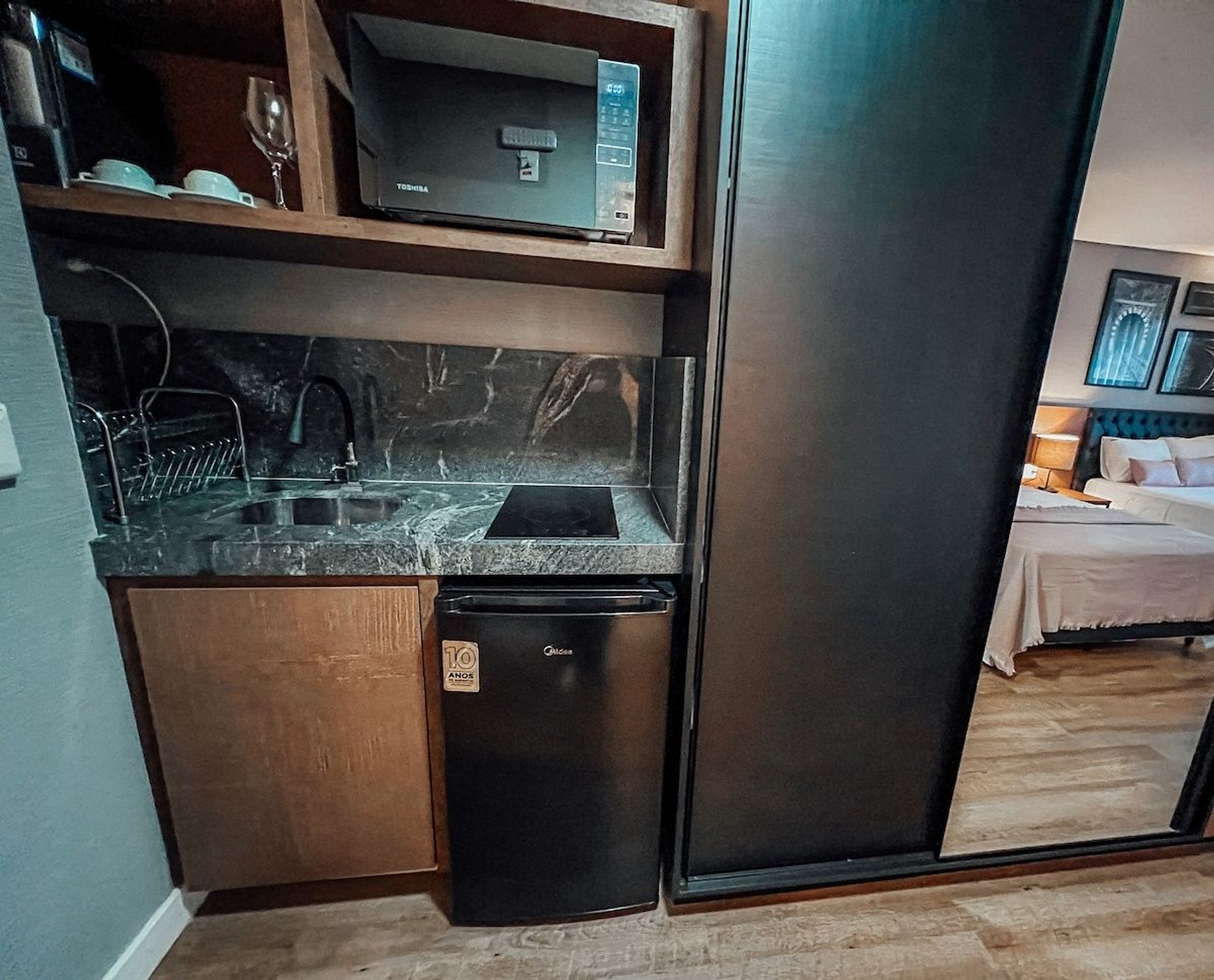 #1501 Fique em um lugar sofisticado perto de tudo o que você quer visitar. Esse quarto super espaçoso é único no hotel por ter uma cozinha para sua facilidade, com 2 camas de casal, ar condicionado, frigobar, tv a cabo, sofá para leitura, desk para seu home office. Você estará perto de tudo, super bem localizado e ainda poderá usufruir do restaurante L'etoile D'argent. Piscina red pool no rooftop com vista para Goiânia, academia completamente equipada para seus treinos ficarem em dia.