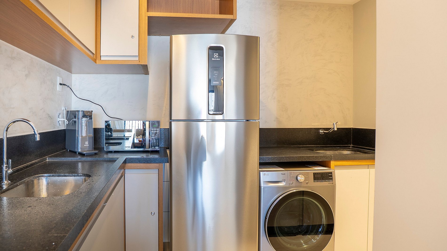 Possui os itens básicos (microondas, panelas, talheres, kit mesa posta, geladeira, roupa de cama, amenities, toalhas, etc )