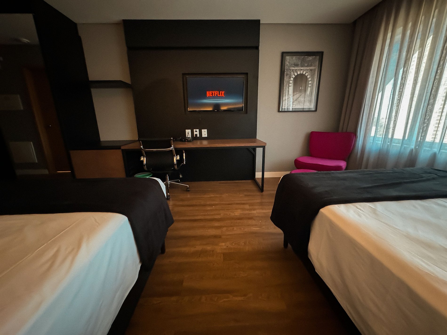 #901 Fique em um lugar sofisticado perto de tudo o que você quer visitar. Esse quarto super espaçoso com 2 camas de casal, ar condicionado, frigobar, tv a cabo, sofá para leitura, desk para seu home office. Você estará perto de tudo, super bem localizado e ainda poderá usufruir do restaurante L'etoile D'argent com sua deliciosa gastronomia francesa. Piscina red pool no rooftop com vista para Goiânia, academia completamente equipada para seus treinos ficarem em dia. Venha viver essa experiência.