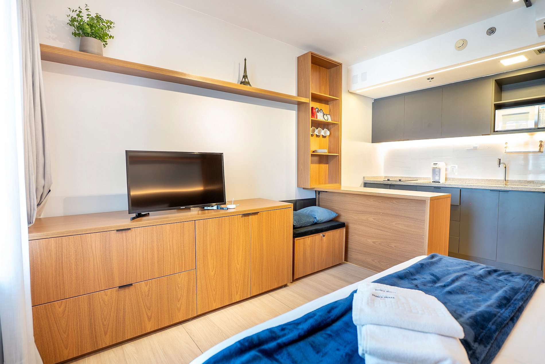 Possui os itens básicos (microondas, panelas, talheres, kit mesa posta, frigobar, roupa de cama, amenities, toalhas, etc)